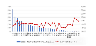 圖 4 2025 年上半年各地區(qū)直接從事生產(chǎn)經(jīng)營活動(dòng)的平均人數(shù)及其增長(zhǎng)情況